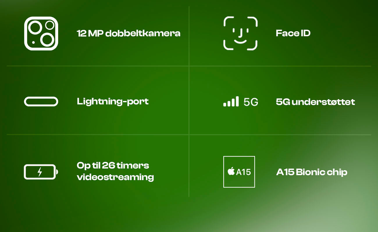 Den kraftfulde A15 Bionic-chip med 5-core GPU sørger for høj ydeevne og lynhurtig grafik, samtidig med at batteriet holder hele dagen.