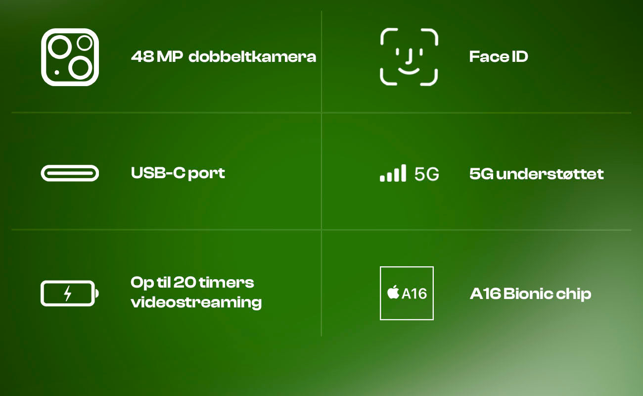 Indeni finder du A16 Bionic-chippen, som leverer hurtig ydeevne og lang batteritid, selv til krævende opgaver. iPhone 15 introducerer også USB-C, hvilket gør opladning og tilslutning mere fleksibel.