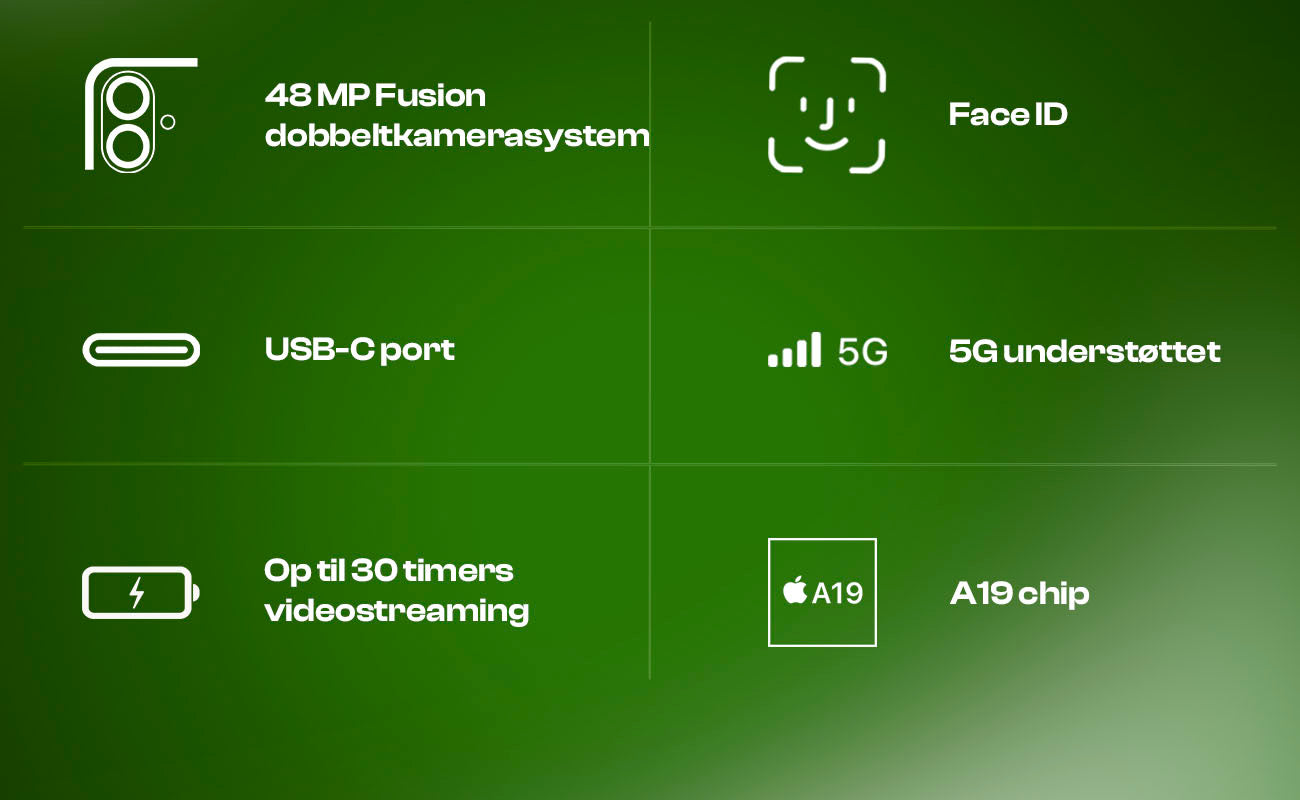 Den nye A19-chip leverer ekstrem ydeevne med 6-core CPU og 5-core GPU, så alt fra foto og video til avancerede AI-funktioner kører problemfrit. Den er hurtig, effektiv og bygget til at holde.
