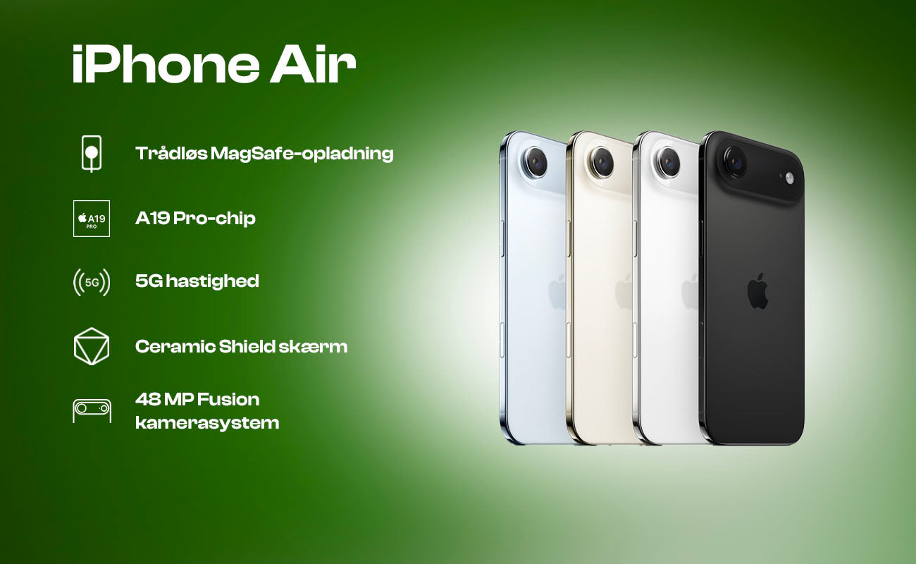 iPhone Air er udviklet til dig, der vil have Apples nyeste teknologi i et lettere og mere prisvenligt design. Den kombinerer høj ydelse med lav vægt og er derfor perfekt til både arbejde, hverdag og fritid.
