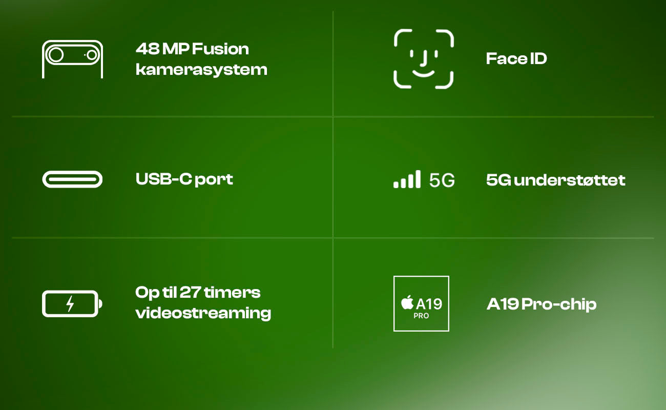 Indvendigt finder du den energieffektive A18-chip, som giver hurtig respons og lavt strømforbrug. Den håndterer alt fra sociale medier til krævende apps uden at miste pusten.