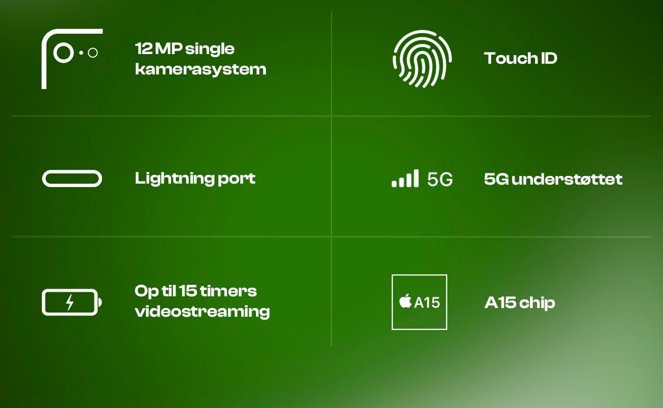 Indvendigt finder du A15 Bionic-chippen, som leverer lynhurtig ydeevne og lang batteritid. Den klarer alt fra multitasking til spil og apps uden problemer og er samtidig energieffektiv.